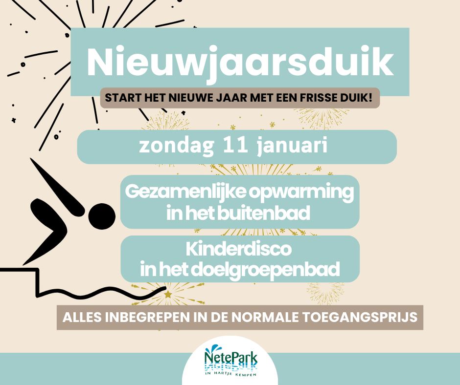 Begin 2026 sportief en feestelijk met de Nieuwjaarsduik in het Netepark op zondag 11 januari. We starten met een gezamenlijke opwarming voor alle deelnemers. Daarna volgen vier duiksessies in het buitenbad om 10.30 uur, 11 uur, 11.30 uur en 12 uur. Ook aan de jongste bezoekers is gedacht: voor kinderen is er een kinderdisco in het doelgroepenbad van 10.30 tot 11.30 uur. Tussen 9 en 12 uur ligt er bovendien extra speelmateriaal in de zwembaden.